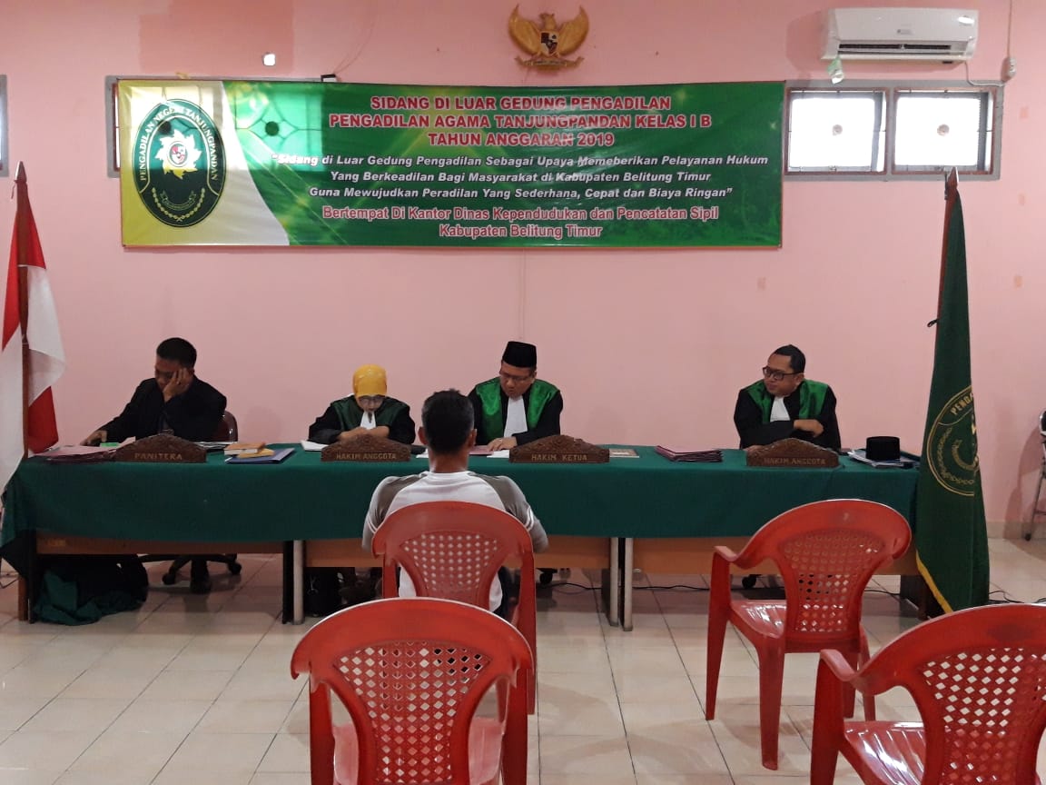 Pelaksanaan sidang di luar gedung pengadilan perdana untuk TA 2019 diselenggarakan pada hari Kamis, 14 Februari 2019 oleh tim sidang di luar gedung Pengadilan Agama Tanjungpandan, yakni Drs. M. Rasyid, S.H., M.H sebagai hakim ketua, Zulfa Yenti, S.Ag., M.Ag dan Dr. Ahmad Syahrus Sikti, S.H.I., M.H masing-masing sebagai hakim anggota, dibantu oleh Abdurrahman Alwi, S.H.I., M.H sebagai mediator, Zainal Abidin, S.H., M.H sebagai panitera dan Meividian Prianto sebagai petugas administrasi persidangan.